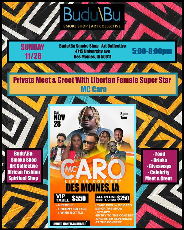 MC Caro will headline a concert, with Bigg Timee, Fada Bless and Wisdom, at Franklin Junior High, an entertainment venue in Des Moines, which can seat 4,500 people. Teamah, CEO of Love Vegas Lingerie Boutique and Mislovely Management, wants concert-goers to put on their finest clothing and arrive early to meet MC Caro at Budu/Bu, a smoke shop, art collective, African fashion and spiritual shop. Attendees will be able to have their photos taken with the artist and refreshments will be served. The concert begins at 8 p.m. on Nov. 28 at Franklin Junior High in Des Moines.