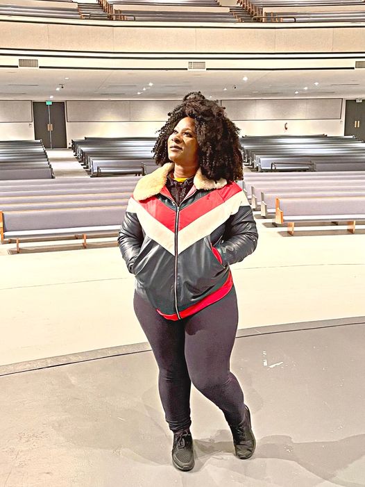 Warleah Love Teamah, a concert promoter, on the stage at Franklin Junior High in Des Moines, where MC Caro will perform on Sunday. Photo by Black Iowa News. |