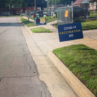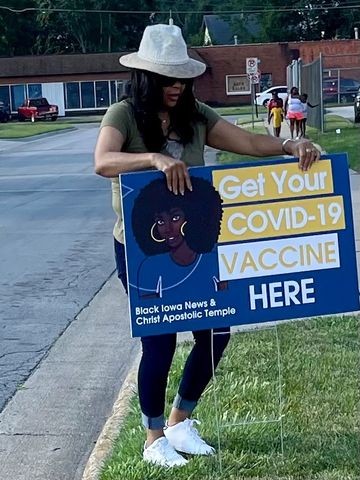 Before sunrise on Saturday, Aug. 28, I stood at the corner of East 17th Street and University Avenue on Des Moines’ east side. Still half asleep, I watched as my husband and his co-worker took the banner I'd made and hung it on a fence near Christ Apostolic Temple. It read: COVID-19 Vaccination Here.