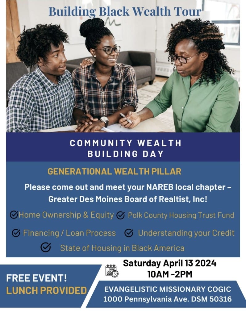 Join NAREB’s Greater Des Moines for Community Wealth Building Day, April 13, 10am-2pm at Evangelistic Missionary Church. Free event!
