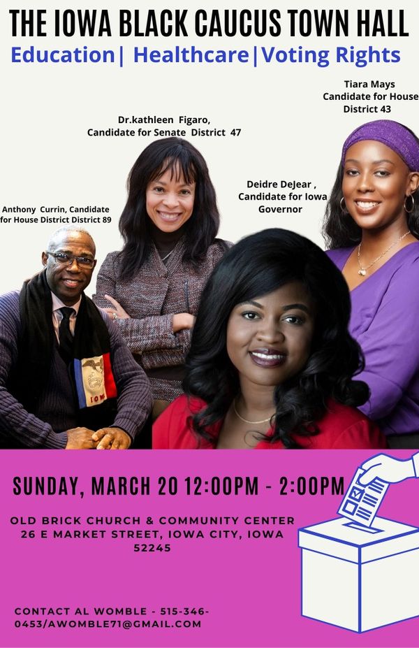 - Iowa Black Caucus Town Hall: Education, Health Care, Voting Rights – Noon-2 p.m. Sunday, March 20, Old Brick Church & Community Center, 26 E. Market St., Iowa City.
