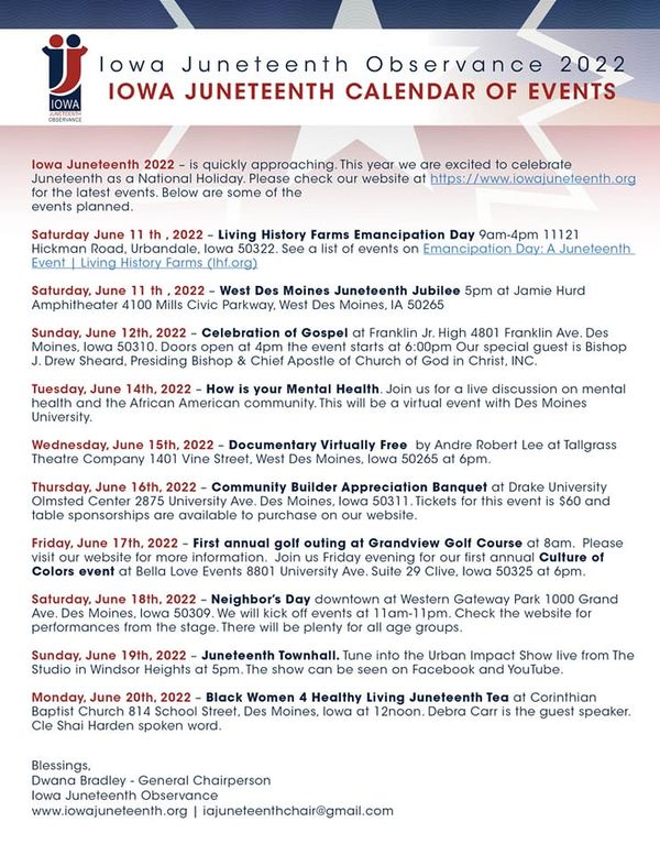 It's almost Juneteenth. Here is a list of some of the many Juneteenth events in Iowa. Want to add an event to this list? Email dana@blackiowanews.com. (This list has been updated 6/10/22.)