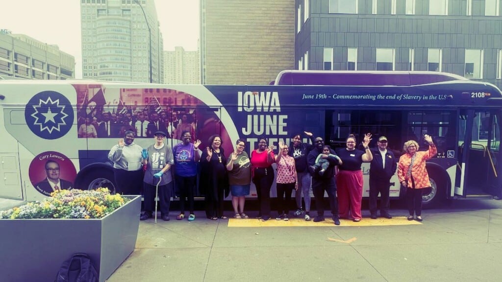 | Iowa Juneteenth Observance General Chairperson Dwana Bradley unveiled the Iowa Juneteenth bus on Thursday in downtown Des Moines. The faces of Bradley and Gary Lawson, Juneteenth general chair emeritus, who founded the Des Moines celebration in 1990 and pushed for and secured the annual statewide recognition in 2002, adorn the bus. The Iowa Juneteenth Observance runs June 9-23 in Des Moines. |
