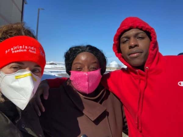 Prairielands volunteer Grace, Leslie Brown and Antwan Brewster on the day Prairielands posted his bail. Photo courtesy of Prairielands. |