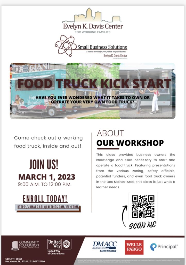 Free Class The Food Truck Kickstart will be held from 9 a.m.-noon on March 1 at the Evelyn K. Davis Center for Working Families. Register today. The class will fill up quickly. This class provides business owners the knowledge and skills necessary to start and operate a food truck. Featuring presentations from the various zoning, safety officials, potential funders, and even food truck owners in the Des Moines area, this class is just what you need if you’ve ever thought about starting a food truck. Contact Senior Business Consultant Curtis Baugh at 515-697-7700 or email him at Curtis.Baugh@dmacc.edu for more information.